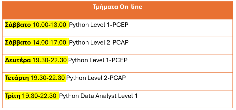 Το Εκπαιδευτικό μας κέντρο προσφέρει μαθήματα κατάρτισης σε όλα τα επίπεδα προγραμματισμού Python, από τον απόλυτο αρχάριο έως προχωρημένο επαγγελματία προγραμματιστή. Τα μαθήματα πραγματοποιούνται διαδικτυακά ή δια ζώσης. Όλα τα προγράμματα σπουδών Python παρέχουν πιστοποίηση στη γλώσσα προγραμματισμού Python του Ινστιτούτου των Η.Π.Α., με εξετάσεις που πραγματοποιούνται στο εκπαιδευικό μας κέντρο.